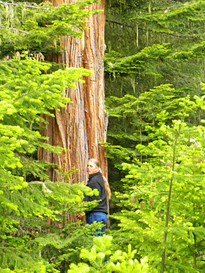 One honking-huge cedar. Jon is seen gazing up into the farthest branches, perhaps contemplating "upper canopy lifeforms" such as squirrels that throw small pointed objects at tourists, or raccoons that will gladly sneak up and bite yer ankles and then scamper off, all the while whispering under their collective breathes "neener neener neener!" Probably he was simply captivated by the overwhelming smell of deep forest, coupled with the underwhelming sound of anything resembling modernity. LARGE |